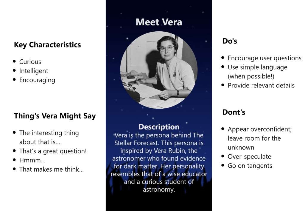 For many voice applications, personas are used by designers to give their actions a distinct personality. Here is a graphic that describes Vera, the voice behind The Stellar Forecast.