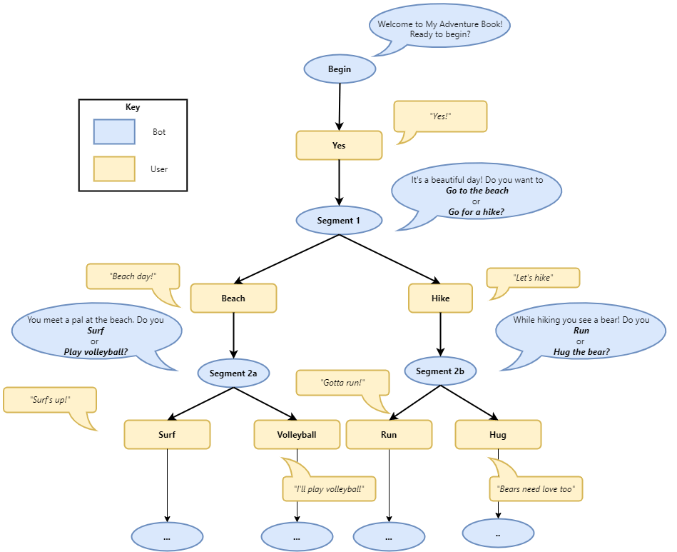 There are many exceptions that must be handled however; designing for these edge cases is what we conversation designers live for after all! In the case of My Adventure Book, users may veer away from the “happy path” to ask the narrator to repeat part of the story or they may ask to hear the rules again. These cases, although not pictured, are perhaps the most important aspect involved in the creation of conversation flows.