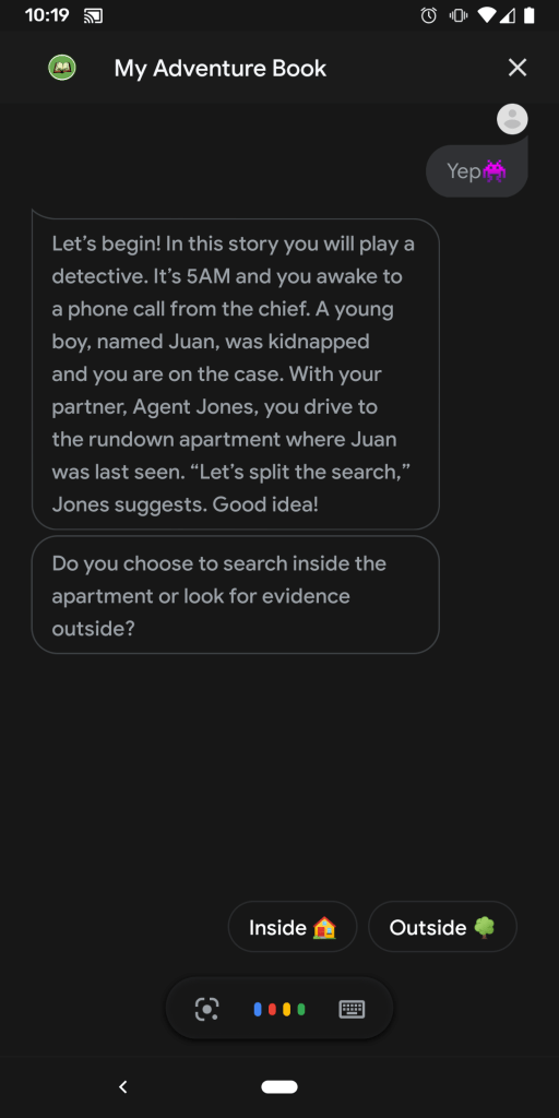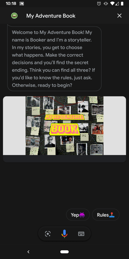 Follow your own journey with My Adventure Book available on the Google Assistant platform. Listen to Booker narrate a story and make choices that influence the outcome. The goal? Try and find all three special endings!